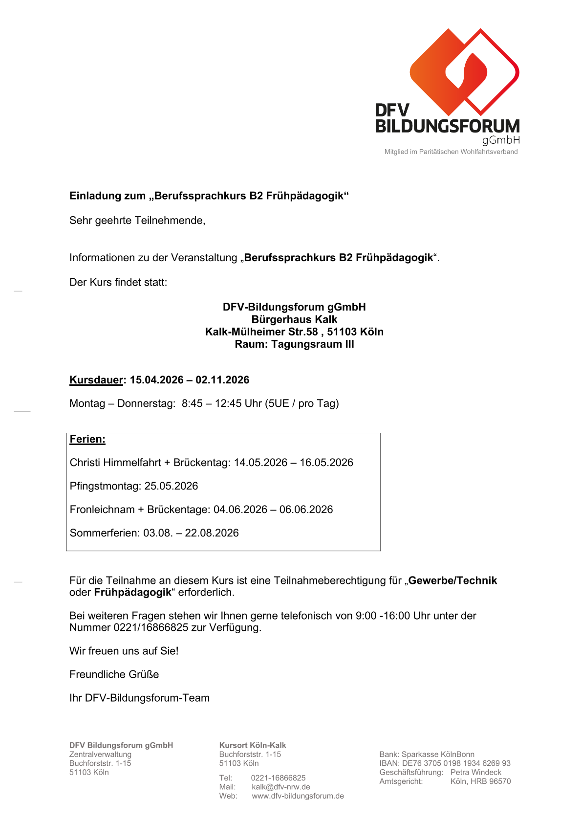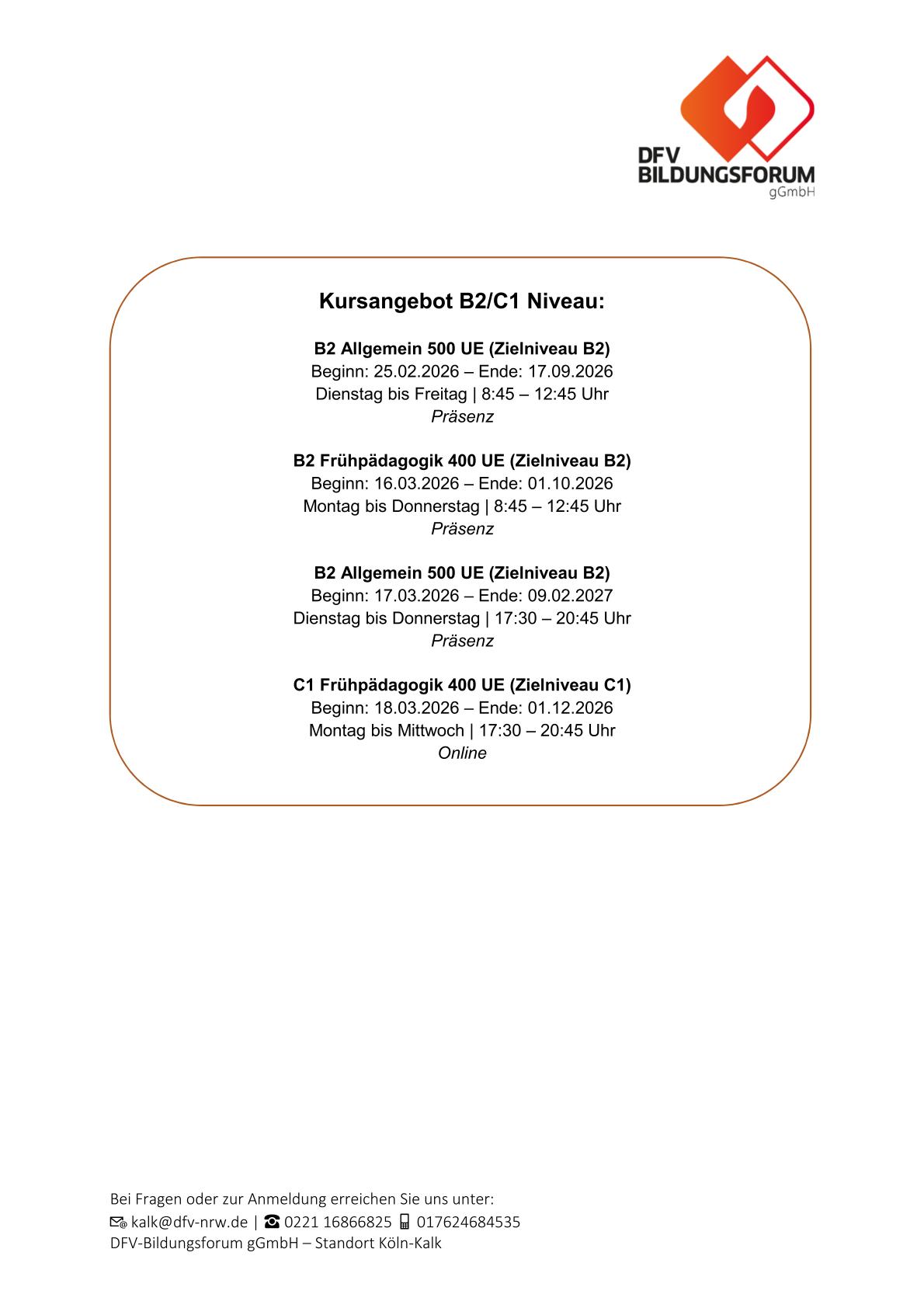 Der Kurs ist für Menschen mit Deutschkenntnissen auf dem Niveau B1 oder B2. Am Ende kannst du die B2- oder C1-Prüfung machen.