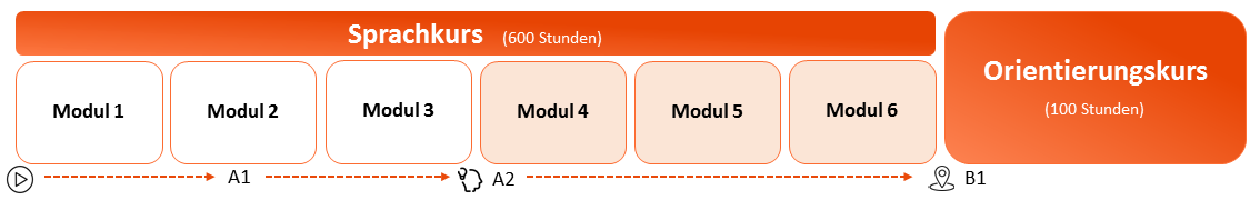 Unsere Kurse sind in Module unterteilt. Ein Modul umfasst 100 Unterrichtseinheiten (UE). Du kannst z.B. im Alphabetisierungskurs bis zu 12 Module absolvieren. Im Anschluss folgt immer der Orientierungskurs, bestehend aus 100 UE.