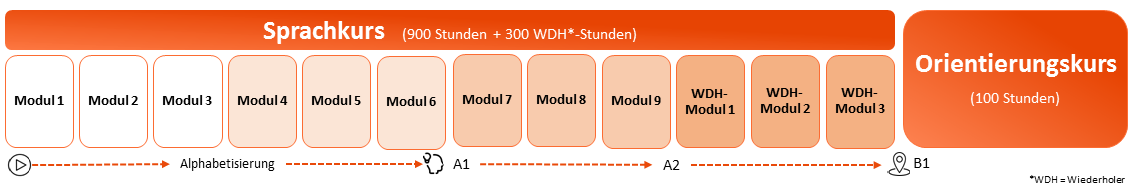 Unsere Kurse sind in Module unterteilt. Ein Modul umfasst 100 Unterrichtseinheiten (UE). Du kannst z.B. im Alphabetisierungskurs bis zu 12 Module absolvieren. Im Anschluss folgt immer der Orientierungskurs, bestehend aus 100 UE.
